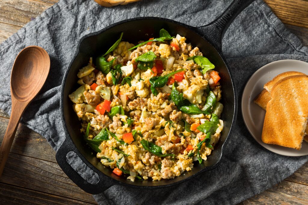 For a continental style scramble, just cook the onions, tomatoes and green chilli. Add a dash of smoked paprika or tobasco if you wish.